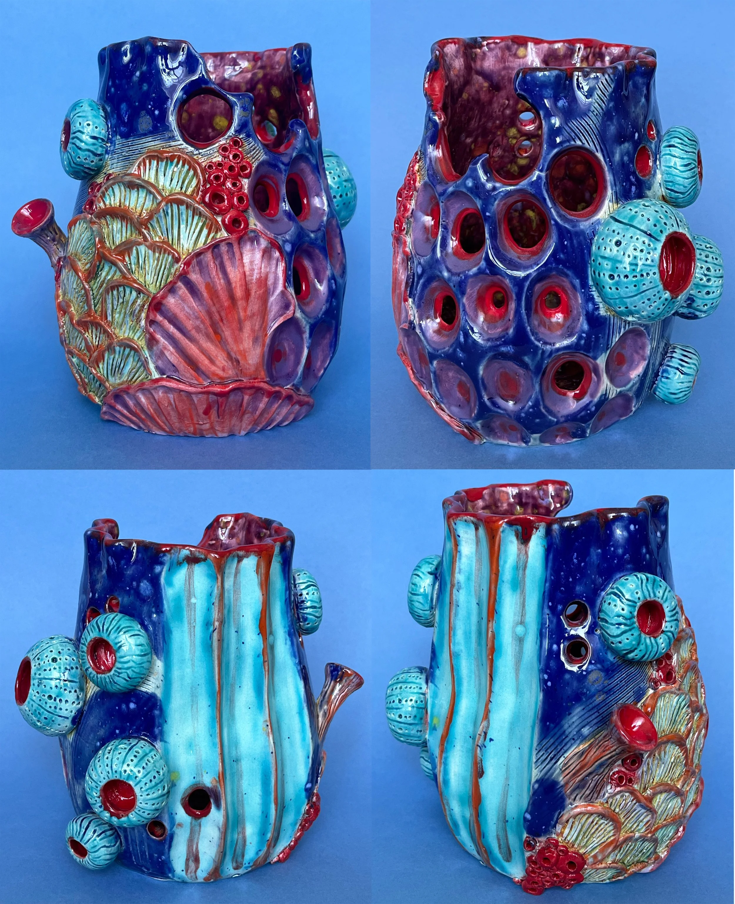 a hand-built ceramics piece that comments on the pollution of our oceans and the consequent destruction of coral reefs. the urchins were thrown on the wheel, off the hump.