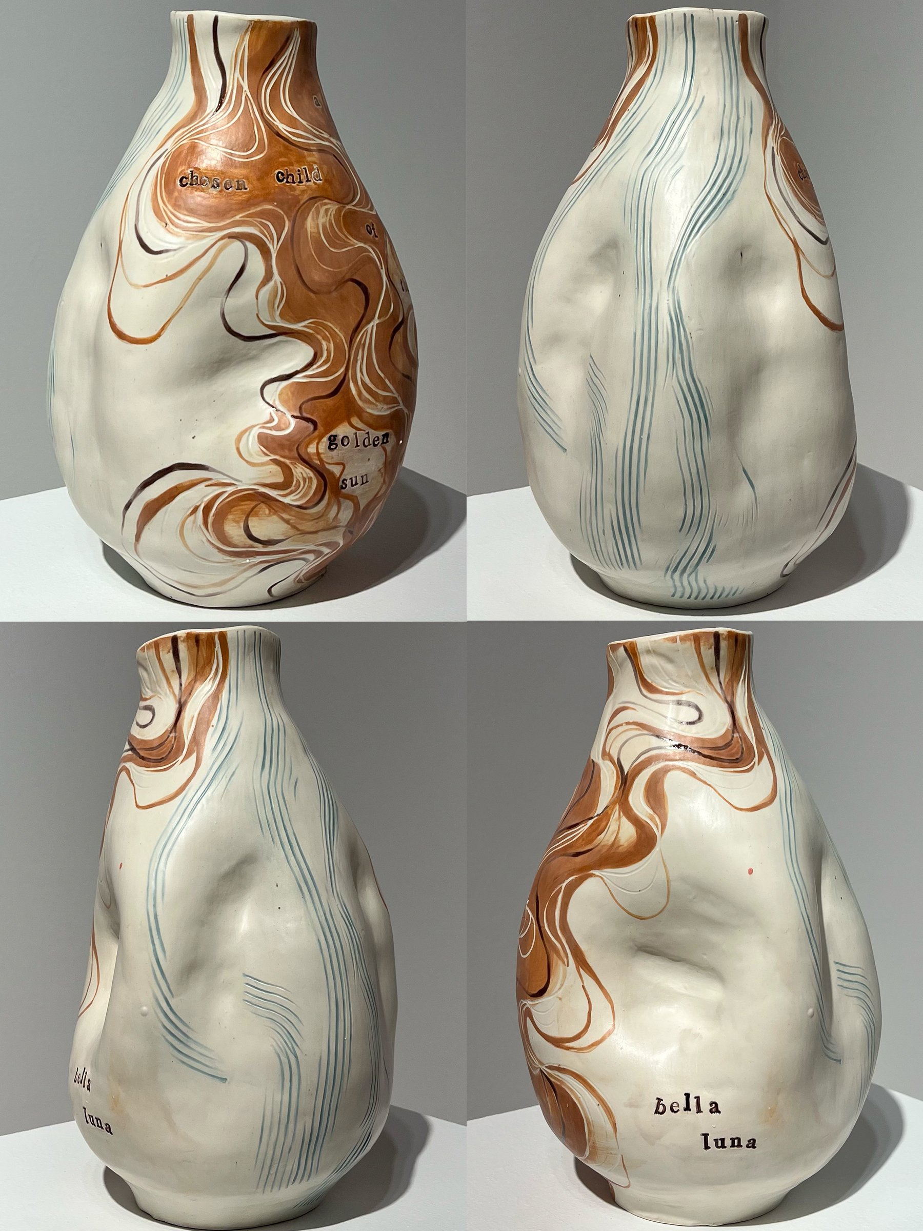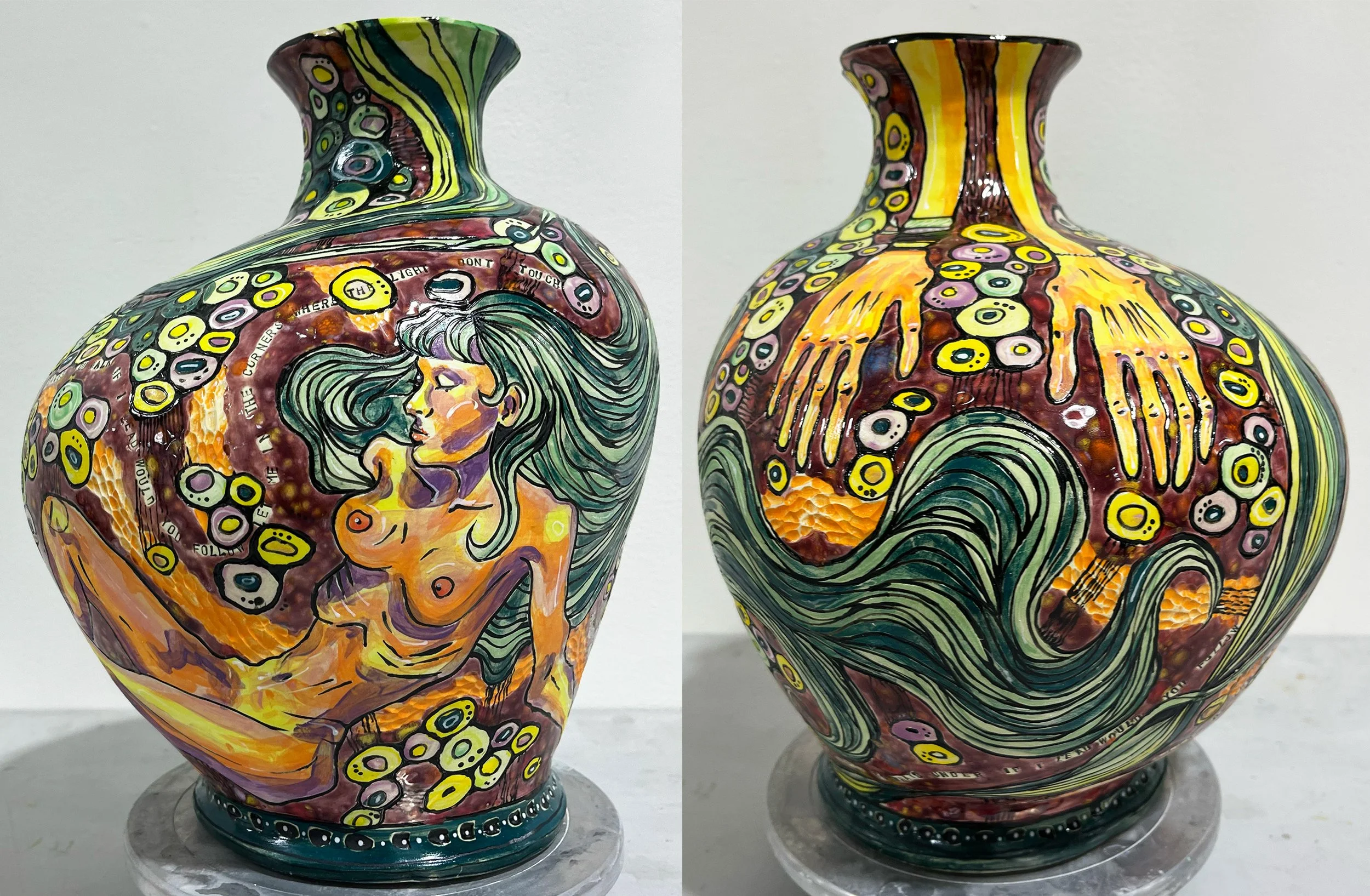 this is a self portrait vase inspired by two of my favorite artists: Egon Schiele and Gustav Klimt. the text printed into the piece is the chorus of the song "If I Lead" by Kiltro, signifying how Klimt and Schiele are leading me on my artistic journey. it is a coil pot that utilizes the sgraffito technique and underglaze painting with some glaze work.