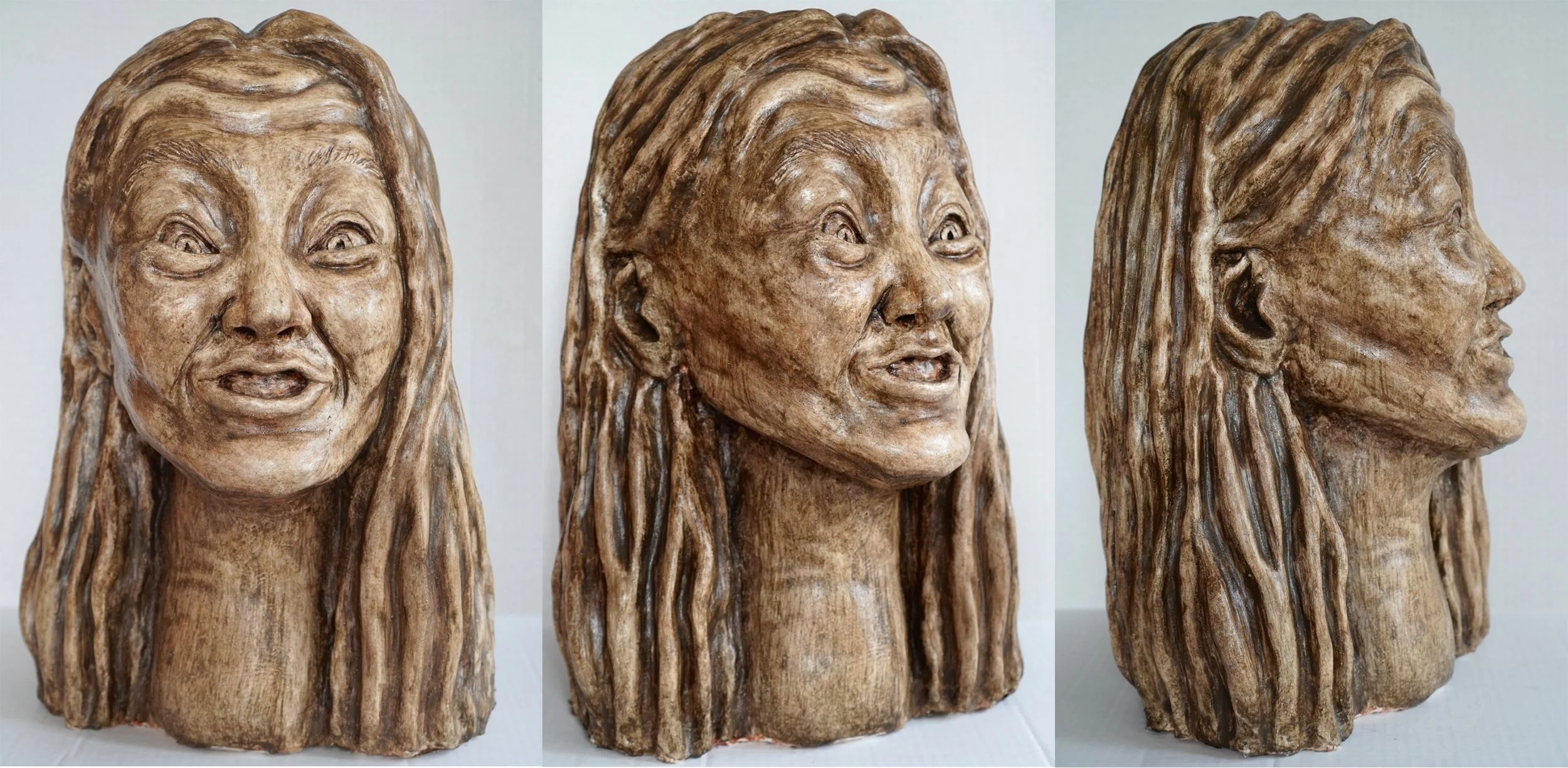 a self portrait bust based on the work of the artist Franz Xaver Messerschmidt. in the Roman Republic, busts of patricians were often over-exaggerated with wrinkles to show the wisdom and maturity of their subjects. Messerschmidt, whose style is often viewed as neoclassical, chooses instead to use wrinkles for depictions of exaggerated grimaces and grins. my bust is an ode to Messerschmidt's ability to confidently portray his own personal demons while still alluding to the wise style of sculpture from the Roman Republic. it toes the fine line between maturity and madness.