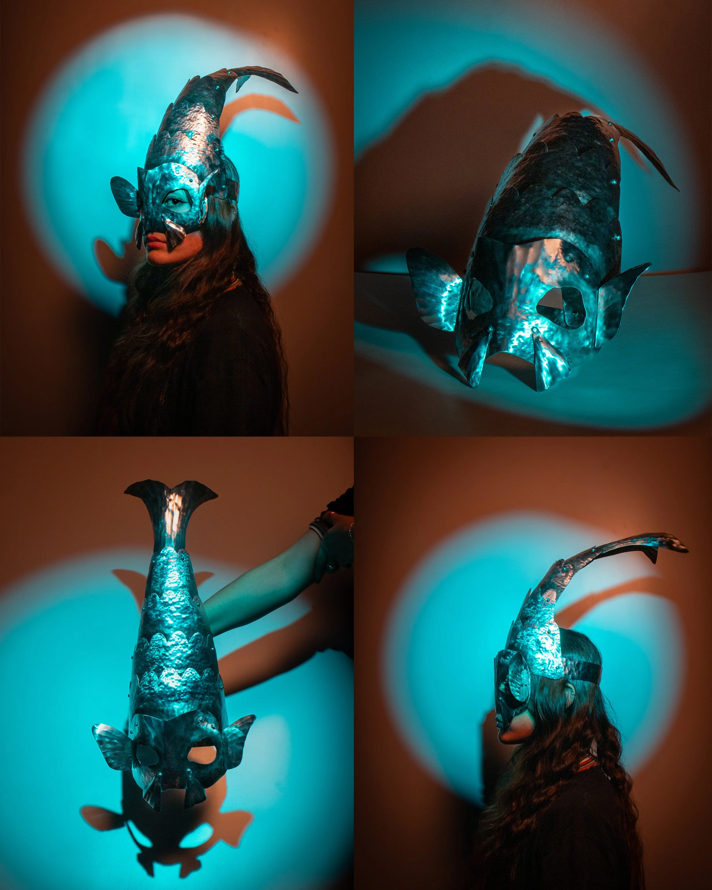 articulated fish headpiece made from hammered steel treated with black magic patina. inspired by japanese samurai helmets. entirely riveted, so the tail flops back and forth, and even the fins and gills move.