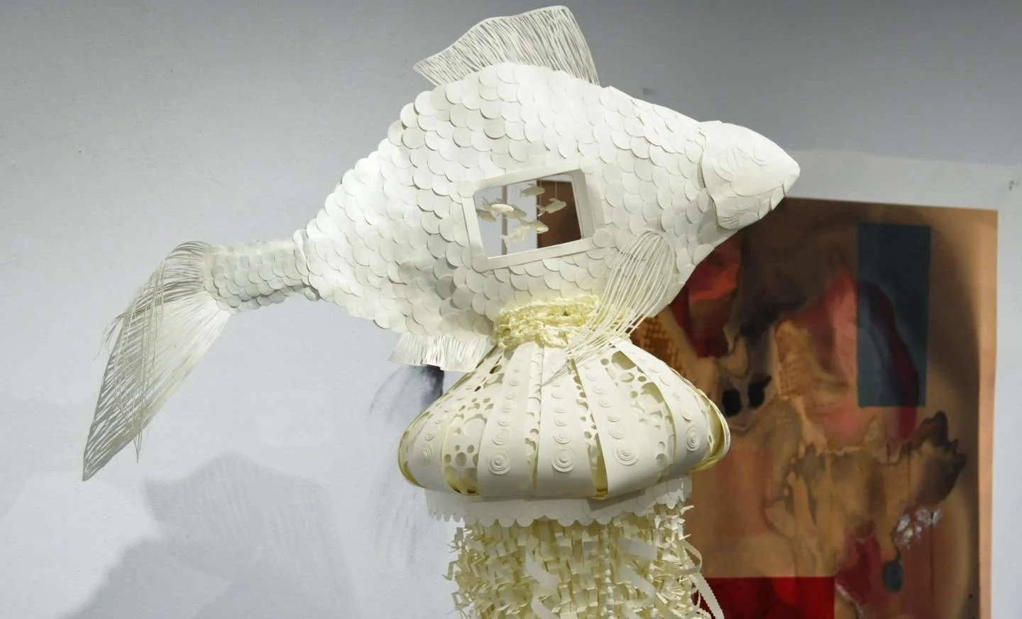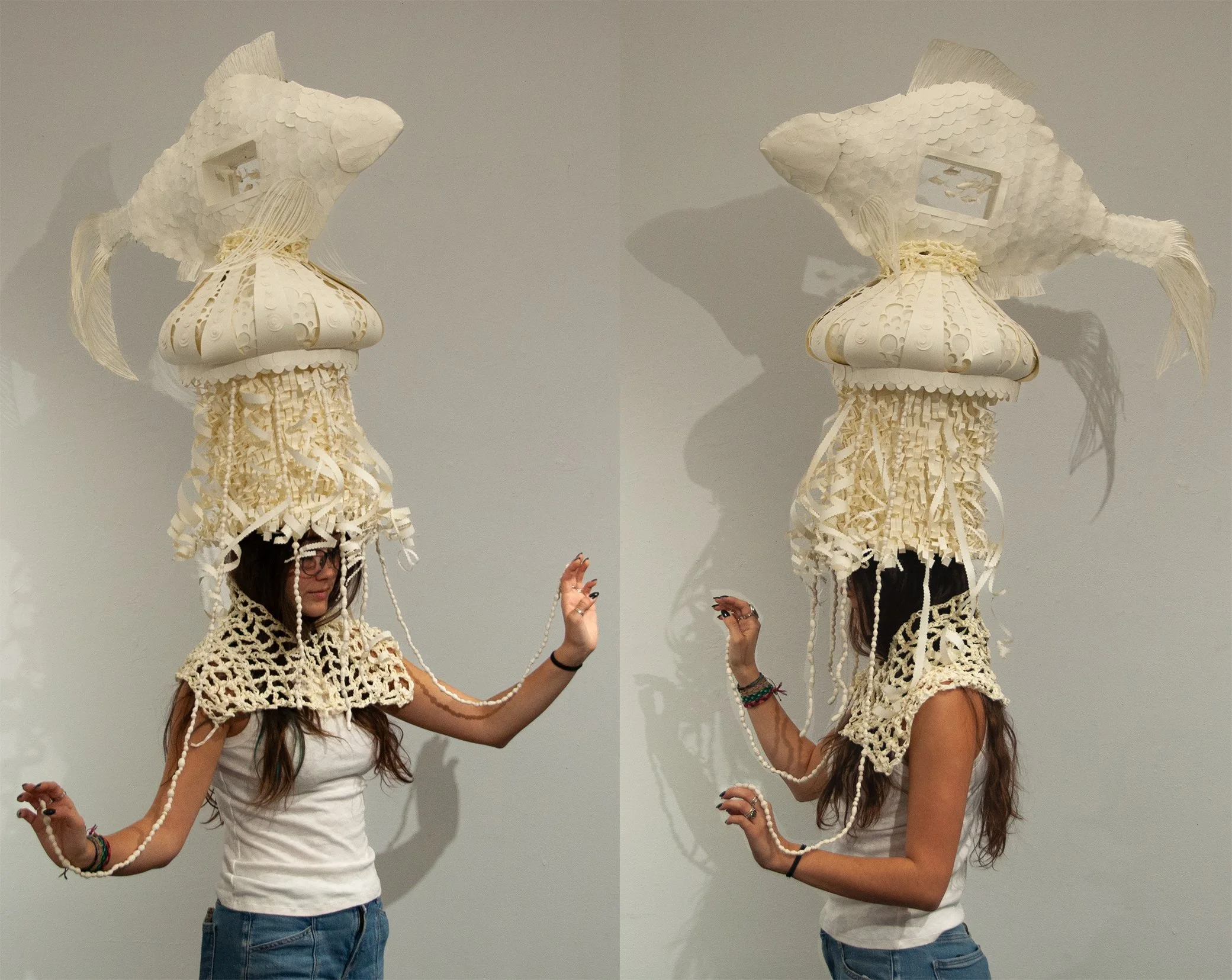 a wearable and interactive wig, with an added crochet paper collar.